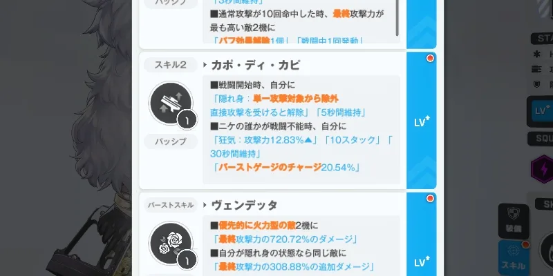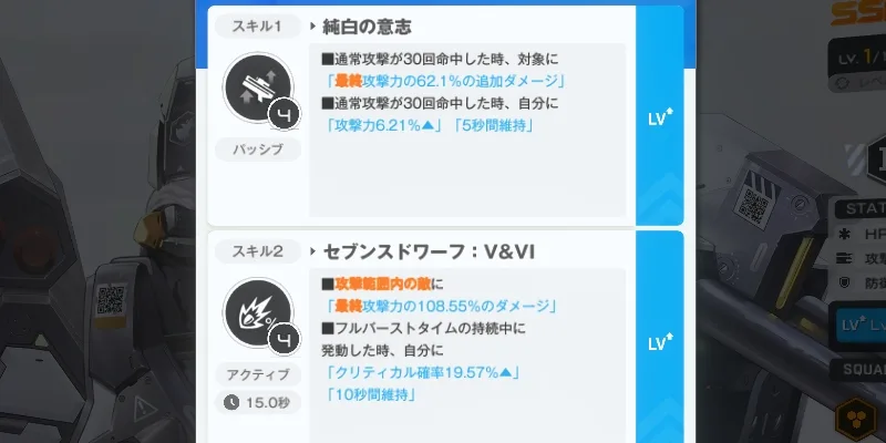 繊細なHPのコントロールなんて序盤はできっこないから、この背水系の効果は考慮から外すとしても、スキル1の攻撃力重複が聞き捨てならない。アサルトライフルなのに通常攻撃10回で条件もゆるいし、何より効果量が高いのでこれだけでピュアアタッカーとしてOK。